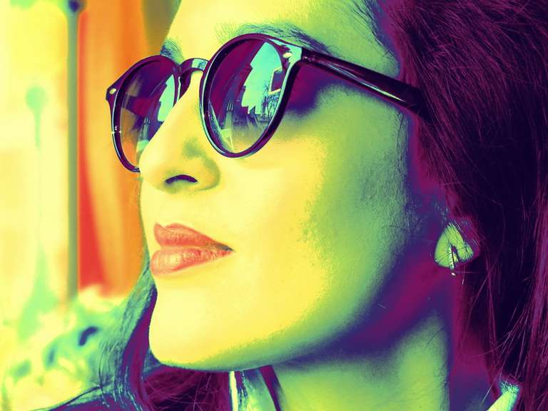 Die Brillengläser der jungen Frau spiegeln eine bebauten Umgebung wieder. In der Spiegelung erkennen wir zackige Bauwerke, Geäst und ein Grabkreuz in der Ferne. Wir sehen die Spiegelung. Aber was kann Kassandra über die >google goggles< noch sehen? Welche Vorhersagen kann Kassandra im Jahr 2021 damit treffen?