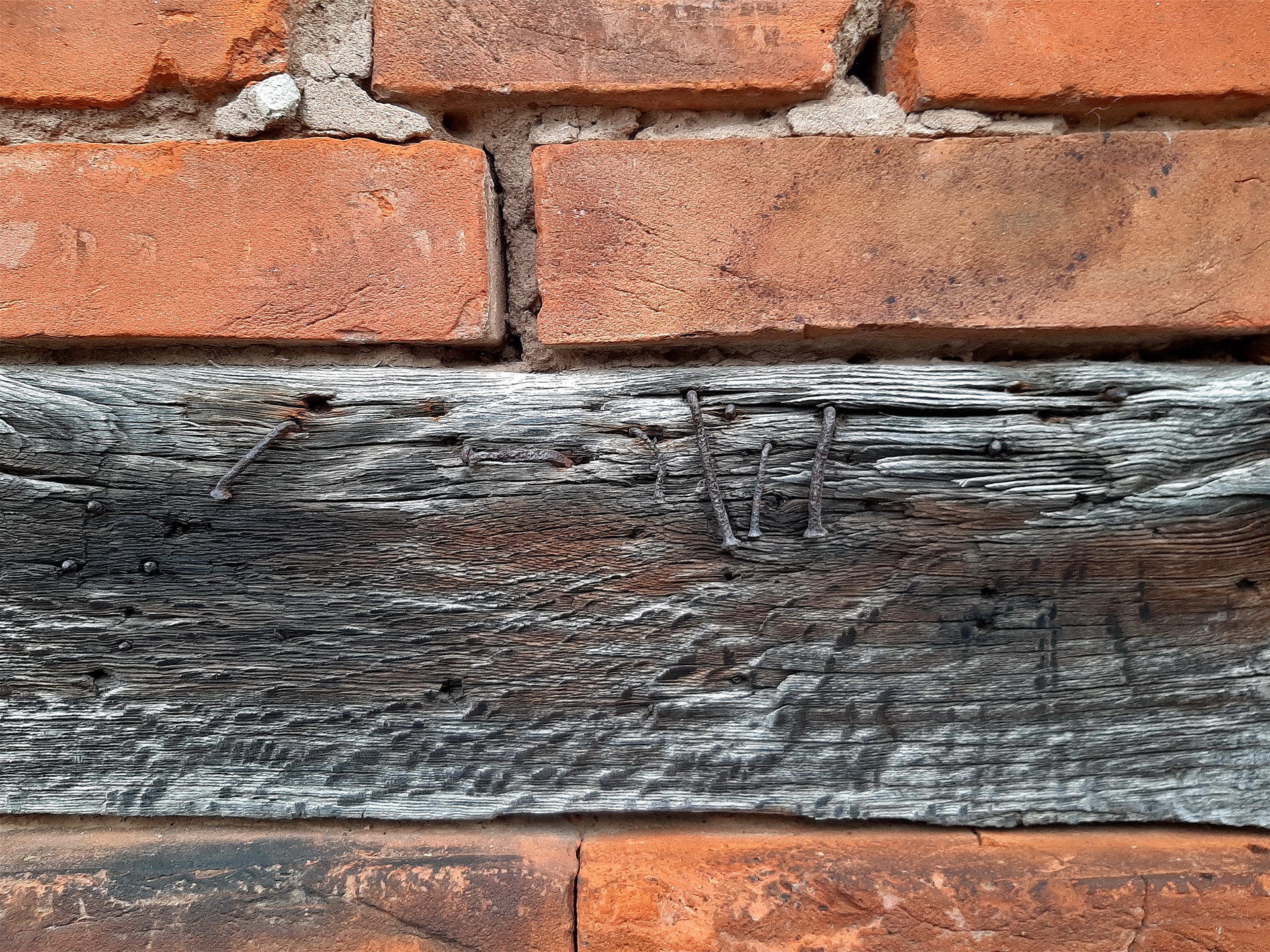 Wir sehen den Ausschnitt einer Mauerwerkswand aus Ziegelsteinen mit Mörtel in den Lager- und Stoßfugen zwischen den Steinen. Die Steine liegen auf einem Holzbalken, augenscheinlich ein sehr alter und verwitterter Holzbalken aus Eiche. In dem Balken stecken Nägel. Krumm und schief. Verrostet und abgezwickt. Einzeln und in Gruppen. Gezogen und gestauchte Drahtstifte, einer sieht geschmiedet aus. Das gesamte Ensemble ist verwittert und alt. Der Fugenmörtel ausgewaschen und spröde.