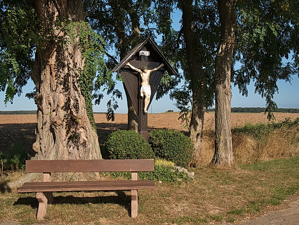 Ein Feldweg, spätsommerlich. Das Marterl steht still zwischen zwei Bäumen, die Bank davor lädt zum Verweilen ein.