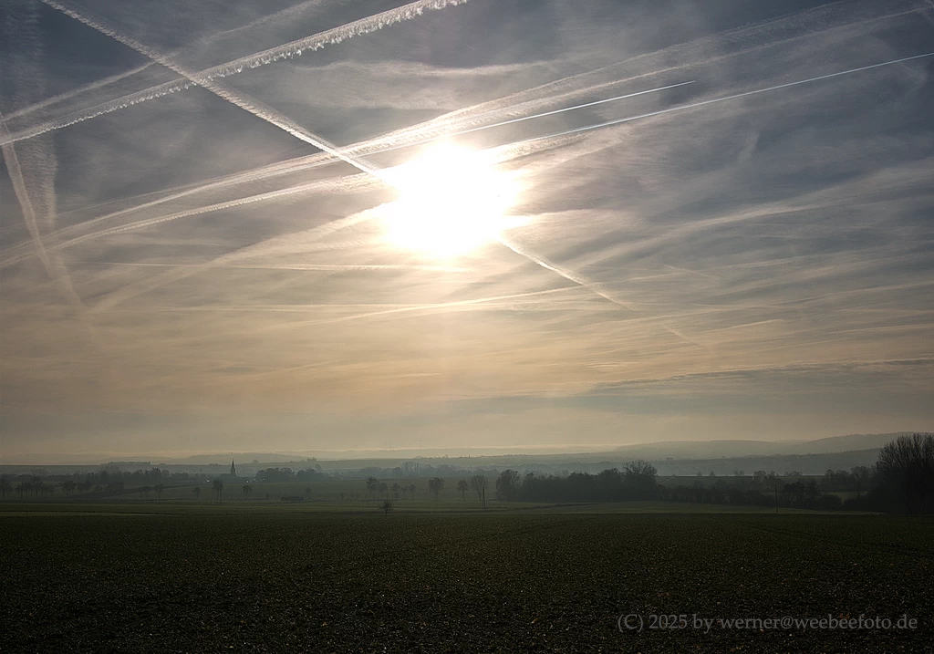 Was bleibt? Die Kirche wird bleiben, die Felder werden bleiben, die Sonne wird wiederkommen. Die Kondensstreifen werden vergehen, wie wir alle vergehen werden. Und doch ist da diese Schönheit in der Vergänglichkeit, in den Linien, die wir ziehen, in den Spuren, die wir hinterlassen, auch wenn sie sich auflösen. Vielleicht ist das die eigentliche Himmelschrift: nicht was wir schreiben, sondern dass wir es versuchen, gegen das Vergessen, gegen die Zeit, gegen den Nebel, der alles verschluckt.